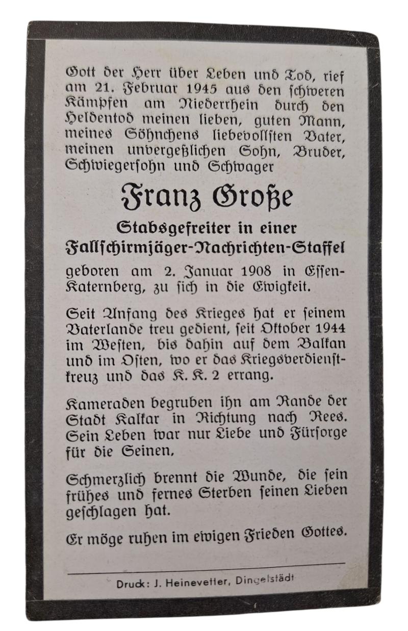 a dead notice from Franz Grobe a stabgefreiter in a fallschimjäger-nachrichen _staffel he passed away on February 21, 1945 in the Niederrhein area. His comrades buried him at Kalkar on the road to Rees.