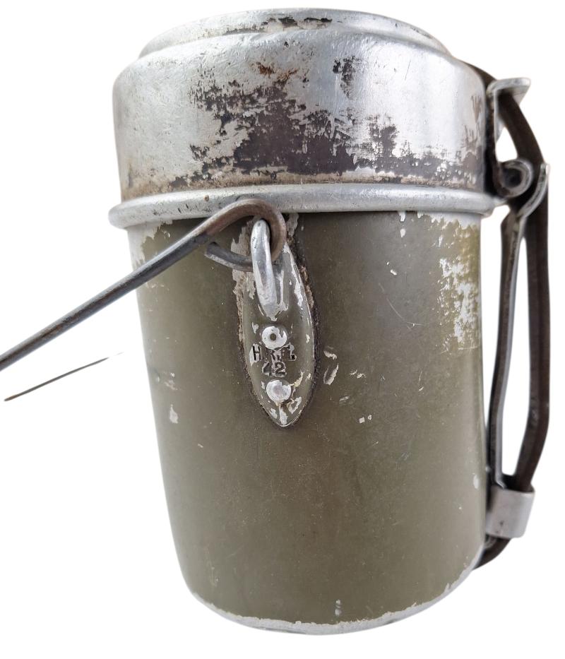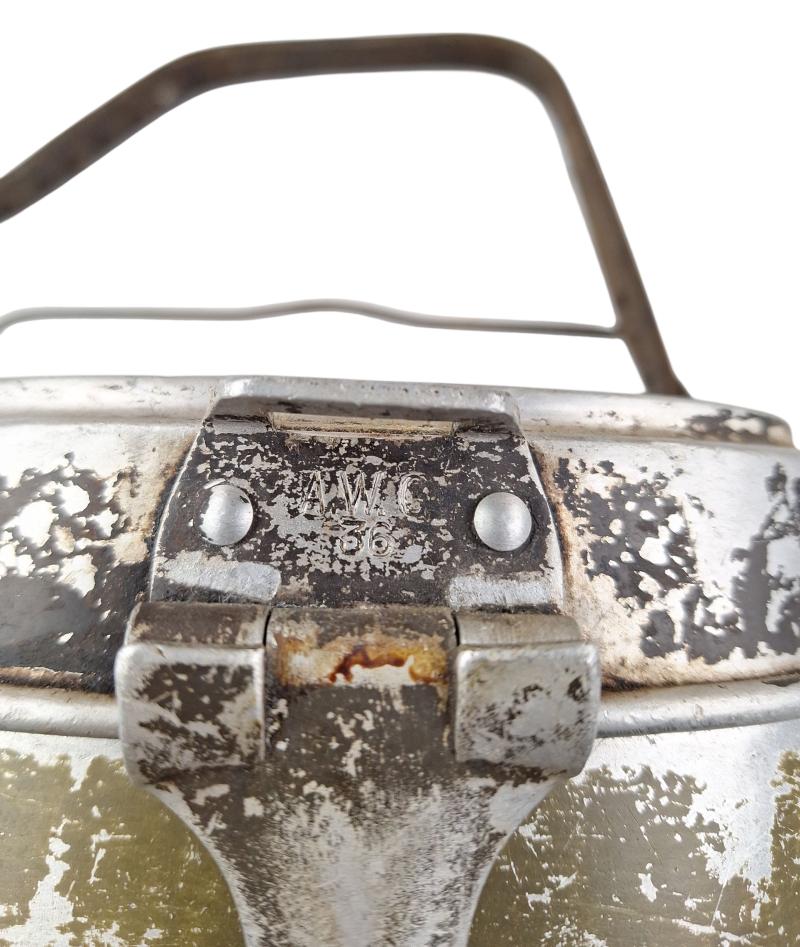 in a havy used condition a German Wehrmacht M31 Messtin (or Essgeschirr). The messtin is maker marked "HRE " and is dated 1942 the top is marked "A.W.C" 36