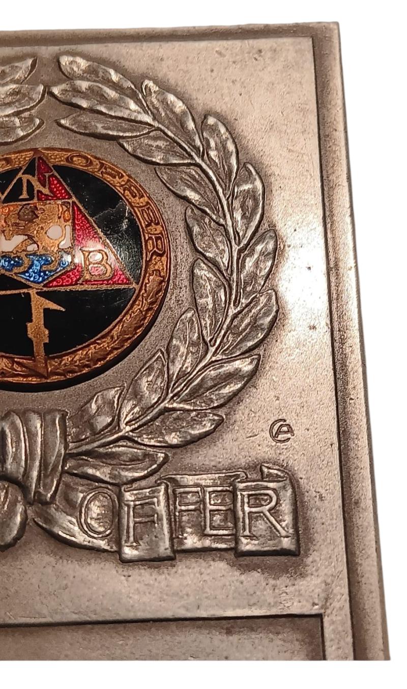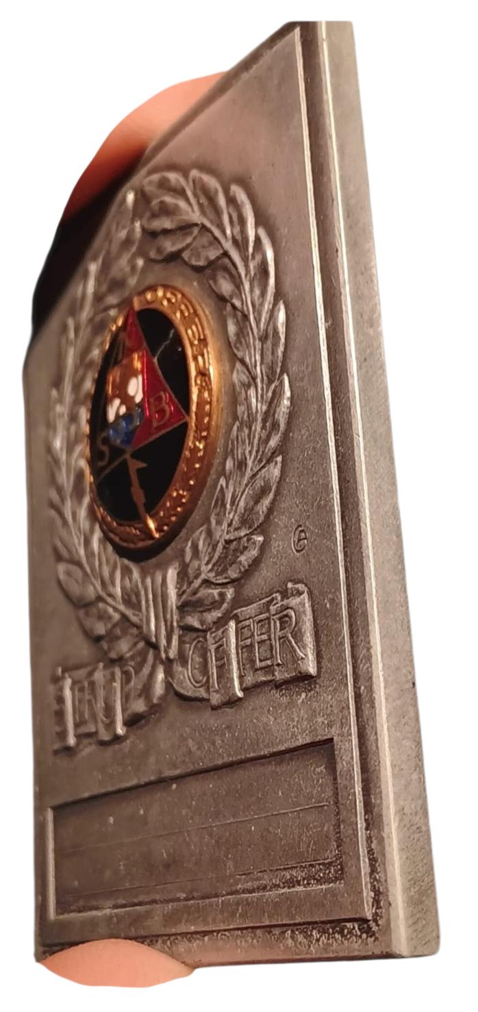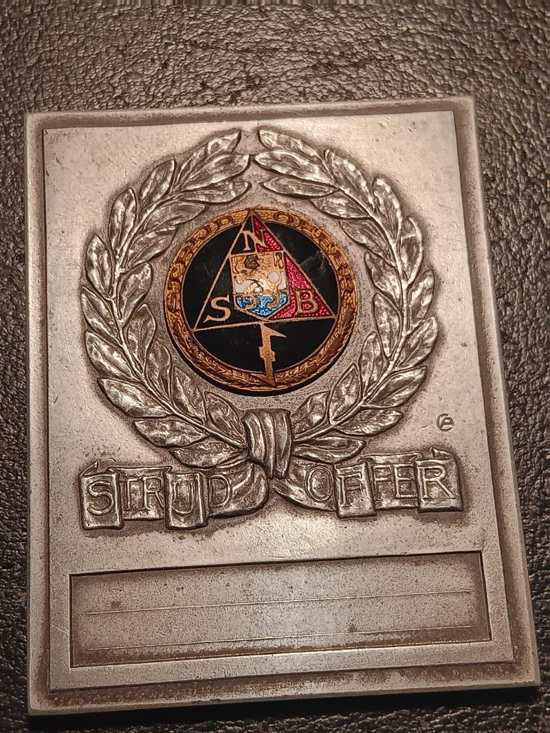 In a very noce used condition a NSB 'Strijd Offer' Plaque (Legpenning). The plaque is sized approximately 7 x 5,5 cms. The plaque was awarded to relatives in memory of deceased NSB members.The enamel badge has been riveted to the plaque, the badge shows some regular wear and patina. The enamelled surface is slightly damaged. Overall a very nice and unique piece. Rare original plaque!