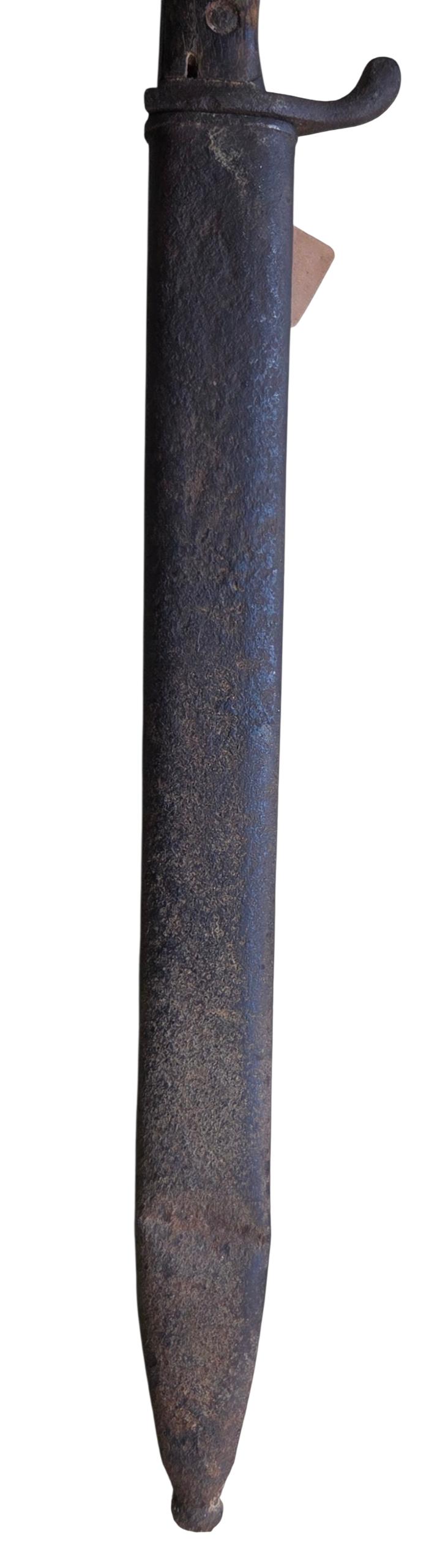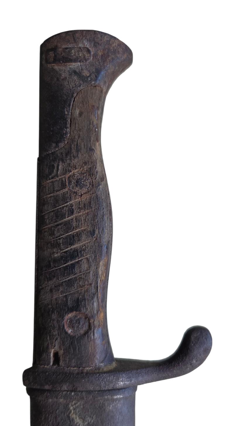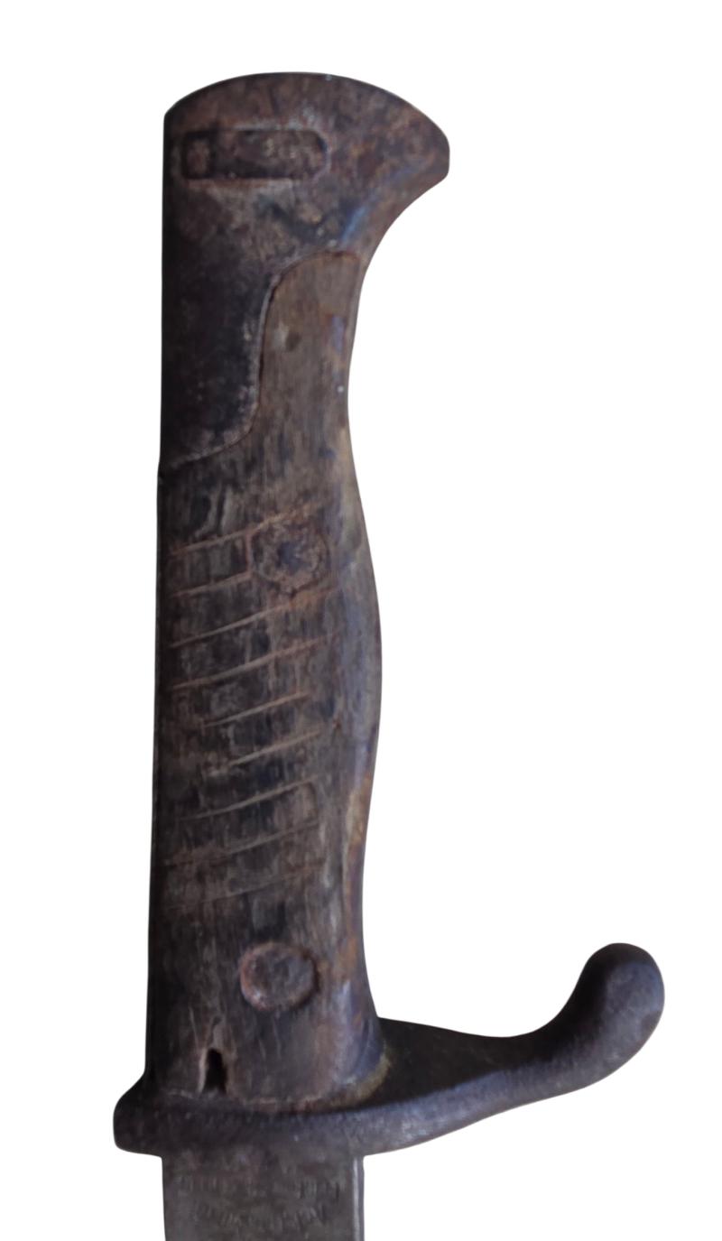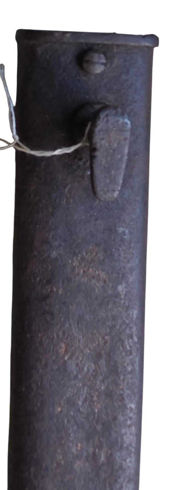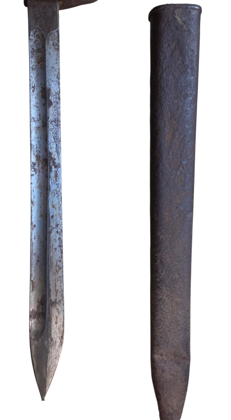in a heavy used condition a German WWI S98/05 Butcher Bayonet he has a marker hard to read only there is a dent in the scabbard in a heavy used condition