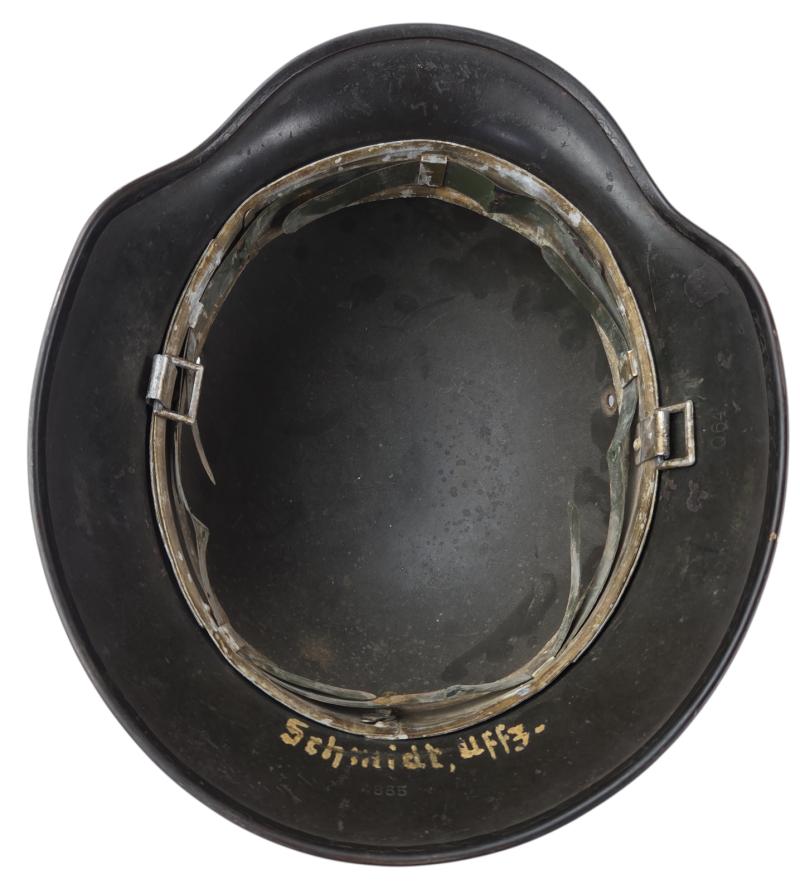 Named uff3 " Unteroffizier " Schmidt" missing chin strap & liner it was first a Luftwaffe helmet, re-issued to a heer you can still clearly see the removal of the decal from the helmet very nice helmet on name