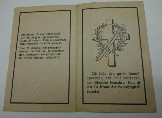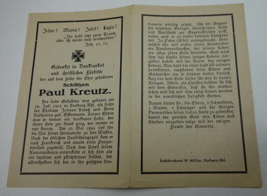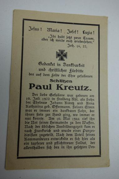 Wehrmacht Soldier Death Notice of paul kreutz he was killid in prum -eifel with a nice story of his service time on the card