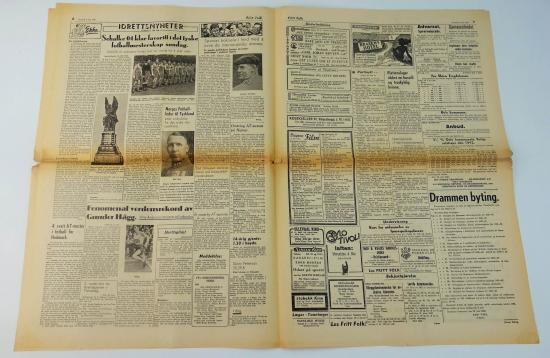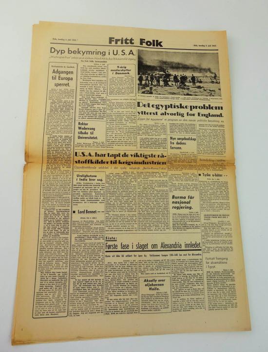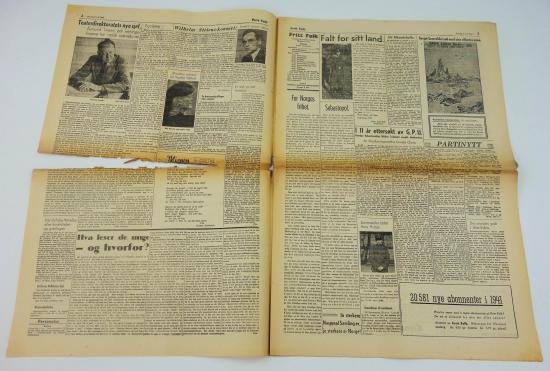 In nice used condition a Norwegian ww2 newspaper "fritt folk " dated July .2, 1942 published in Oslo.It was the official organ of the fascist party Nasjonal Samling unfortunately there is a tear in the first 2 pages