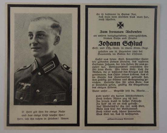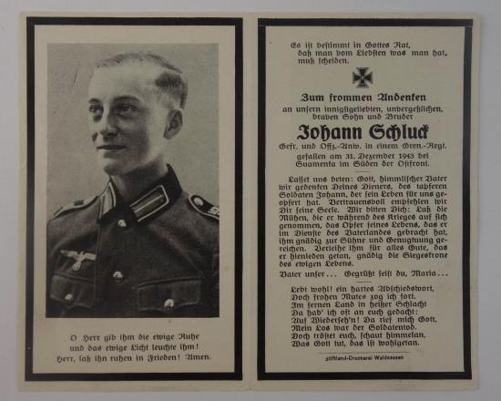 Wehrmacht Soldier Death Notice off "Johann Schluck "a gefreiter in a gren -regt he passed away on 31-12-1943" ask for shipping costs sometimes it can be sent for less paypal can be used as a friend