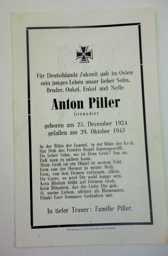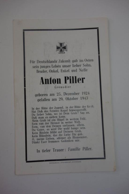 Wehrmacht Soldier Death Notice of "Anton Erich Piller "a grenadier he passed away at age 19 on 29-10-1943" ask for shipping costs sometimes it can be sent for less paypal can be used as a friend