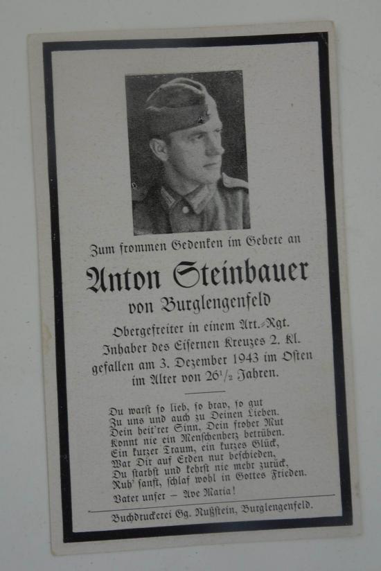 Wehrmacht Soldier Death Notice off "Anton Steinbauuer Schluck "a ober gefreiter in a art -rgt he passed away on