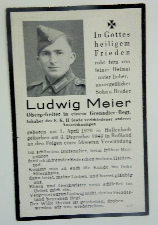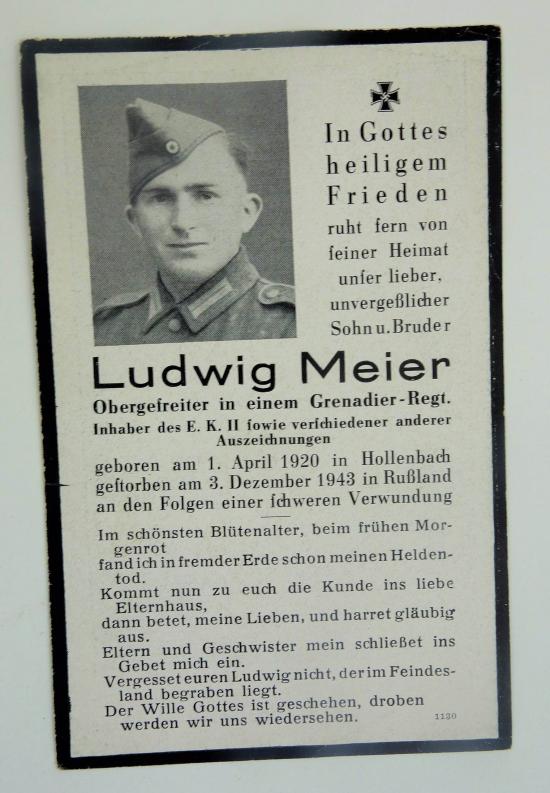 Wehrmacht Soldier Death Notice of "Ludwig Meier "a obergefreiter in a gren-regt he passed away at age 23 on