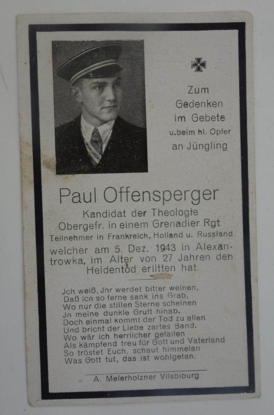 Wehrmacht Soldier Death Notice of "Paul Offensperger "a obergefreiter in a gren- rgt he passed away at age 27 on