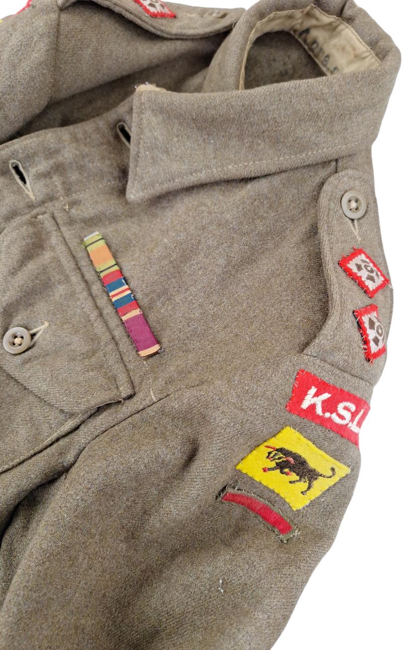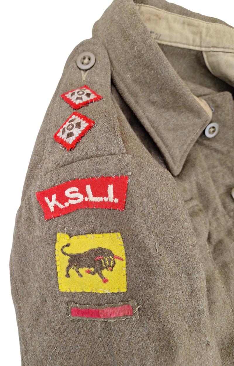in a very nice used condition A British P40 K.S.L.I battle dress the emblems are not originally placed on the jacket but are original ksli "king's shropshire light infantry patch " and a 11th Armoured Division patch dated 1944 in a size 13 very nice for display