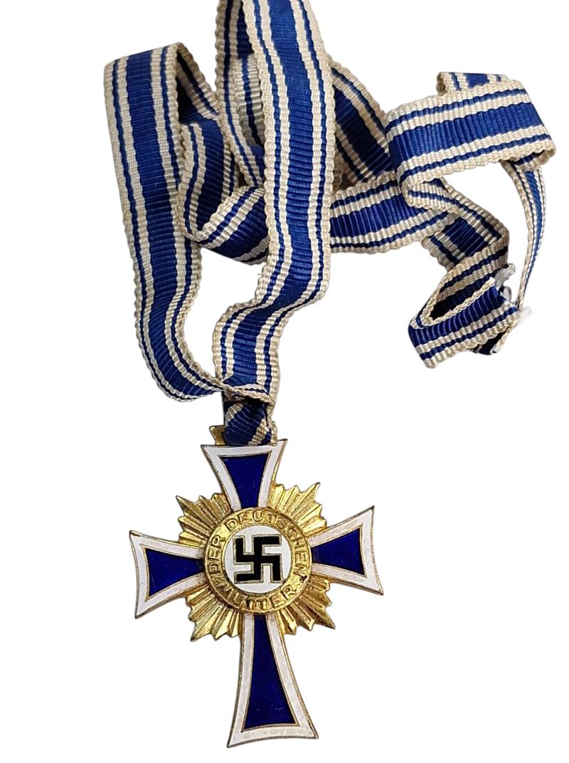 in a nice used condition a german ww2 mother cross in gold in its original box its markerd with ( R. Hauschield) in a beautiful condition