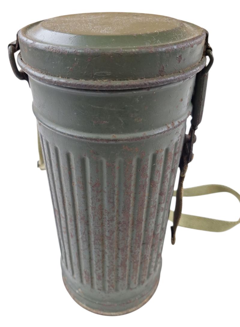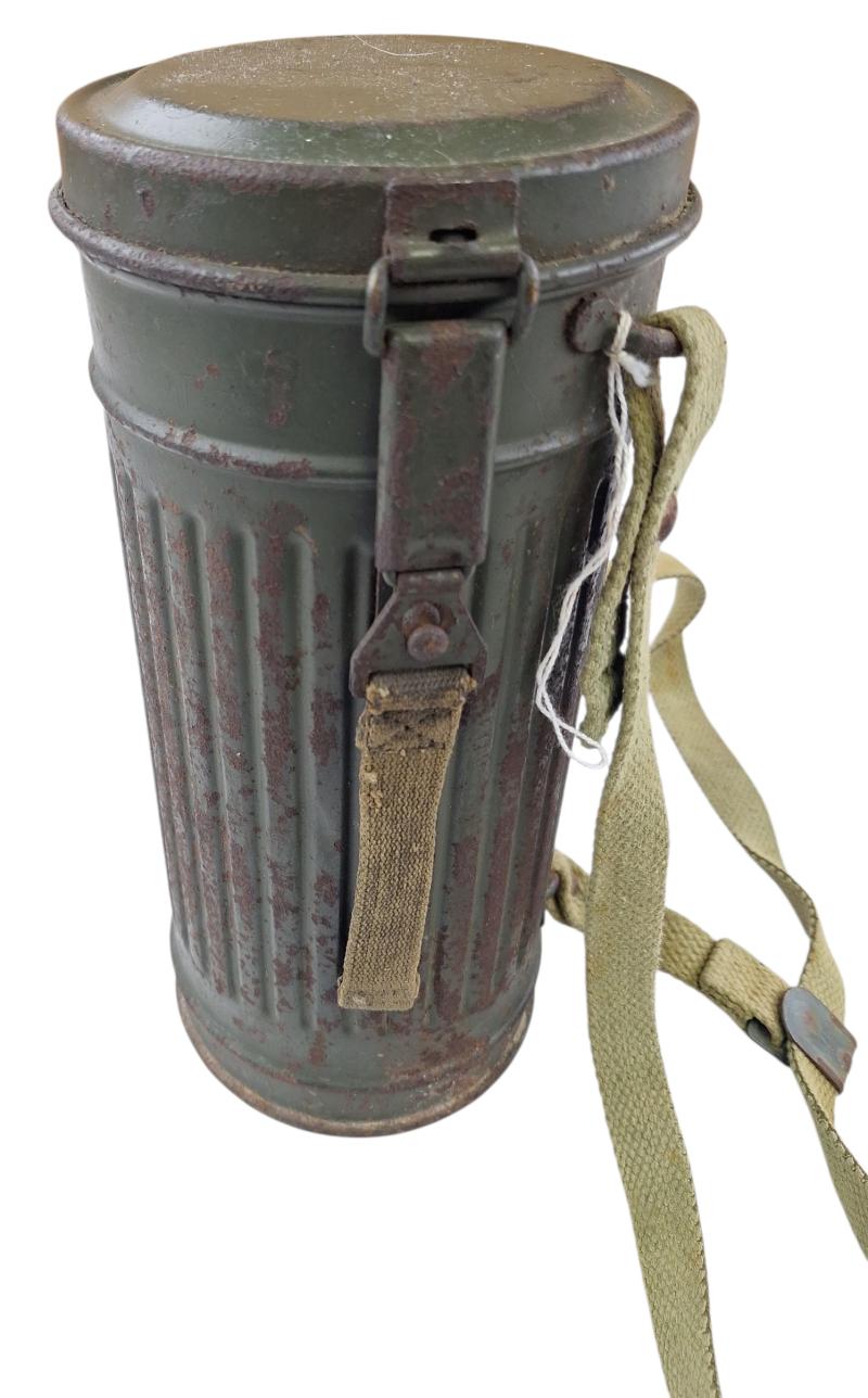 in a very nice used condition a tall m38 gasmask with original carrying strap dated i think 1941 but it is very difficult to see its marked but no longer readable