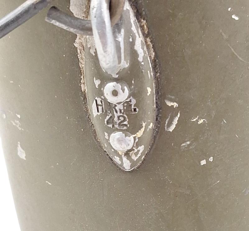 in a havy used condition a German Wehrmacht M31 Messtin (or Essgeschirr). The messtin is maker marked "HRE " and is dated 1942 the top is marked "A.W.C" 36