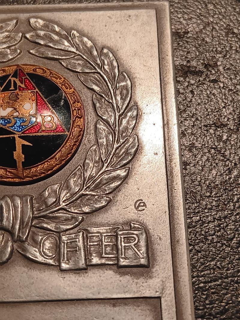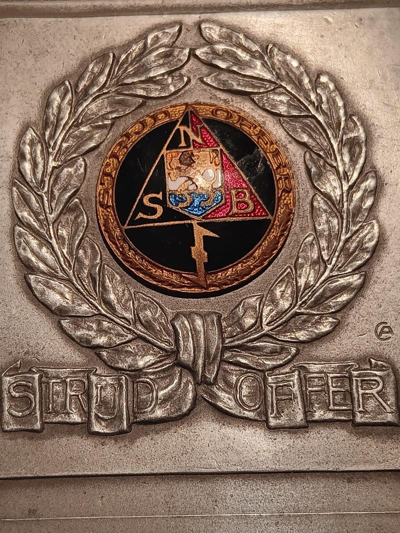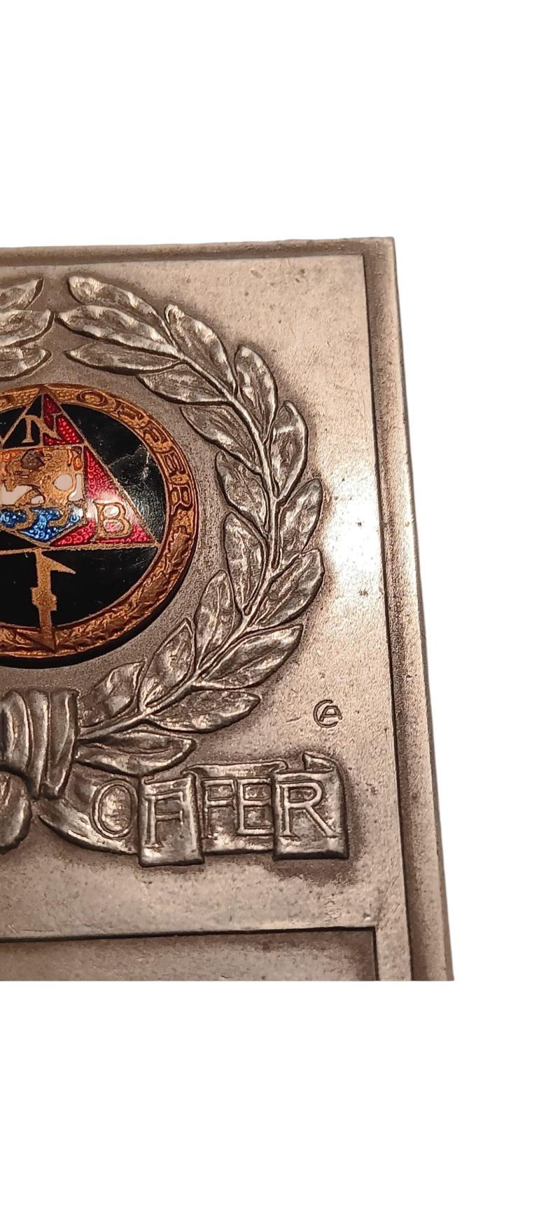 In a very noce used condition a NSB 'Strijd Offer' Plaque (Legpenning). The plaque is sized approximately 7 x 5,5 cms. The plaque was awarded to relatives in memory of deceased NSB members.The enamel badge has been riveted to the plaque, the badge shows some regular wear and patina. The enamelled surface is slightly damaged. Overall a very nice and unique piece. Rare original plaque!