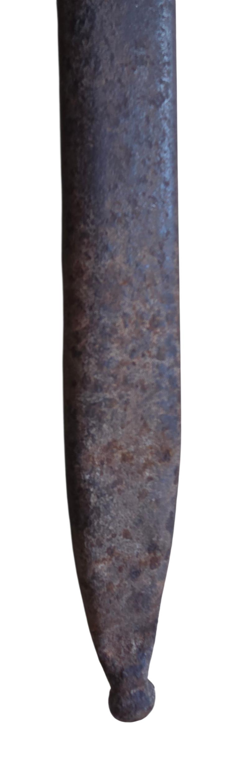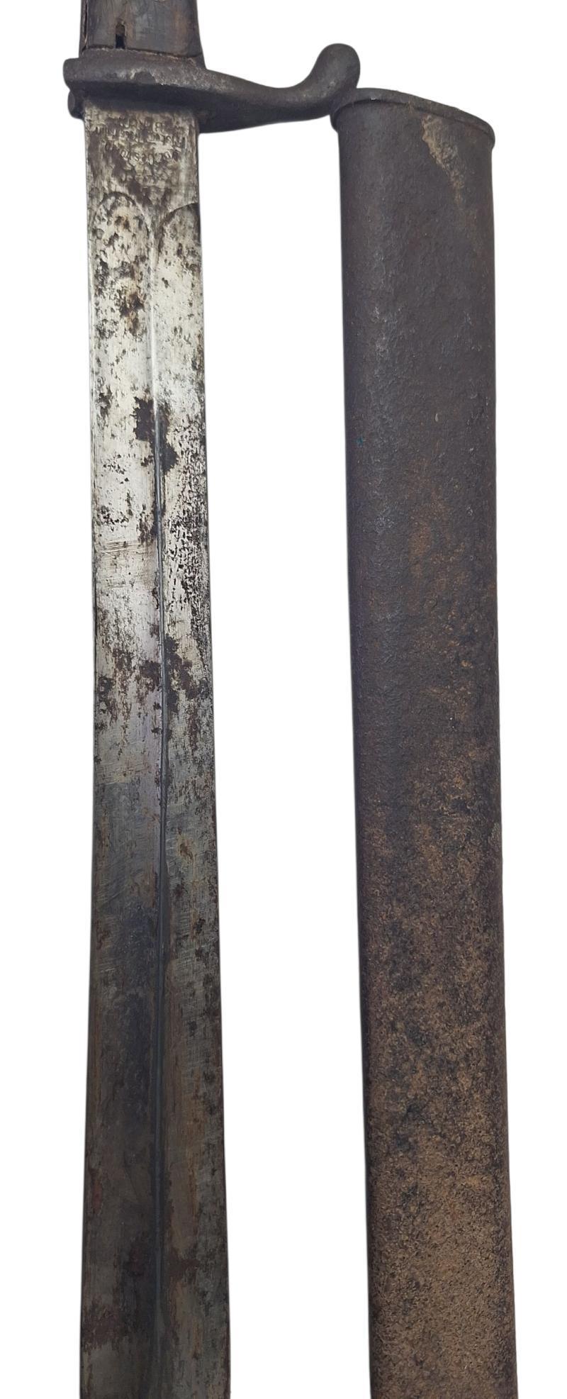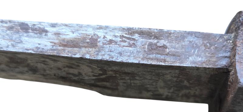 in a heavy used condition a German WWI S98/05 Butcher Bayonet he has a marker hard to read only there is a dent in the scabbard in a heavy used condition