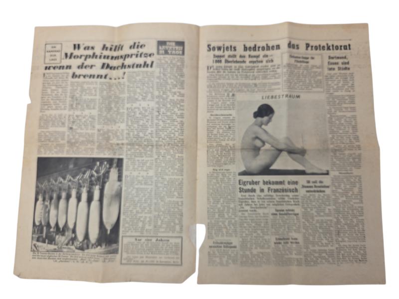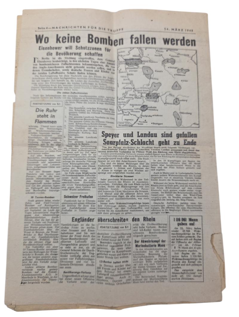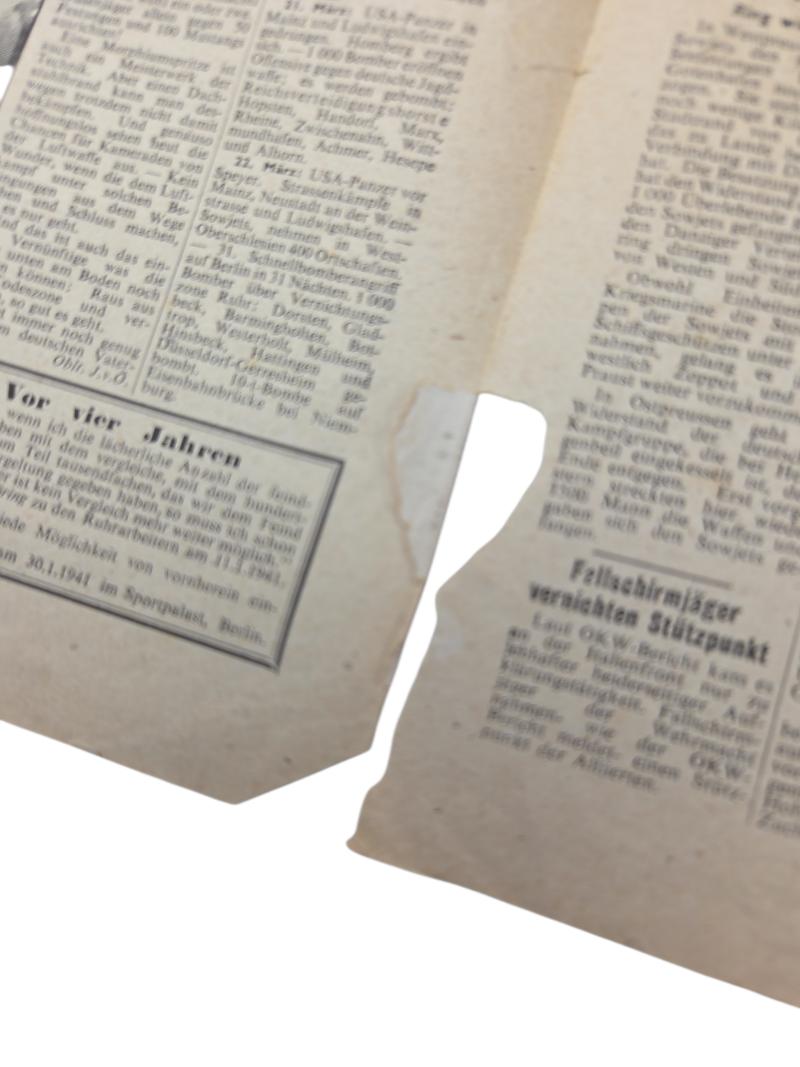 in a used condition a newspaper made for the German army dated March 24, 1945 there is a hole in the middle visible in the photo