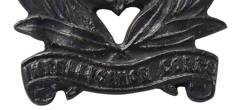 Original WWII Intelligence Corps cap badge, brass/bronze, worn on uniform or beret. Good condition, authentic period piece. Perfect for collectors or historical displays.