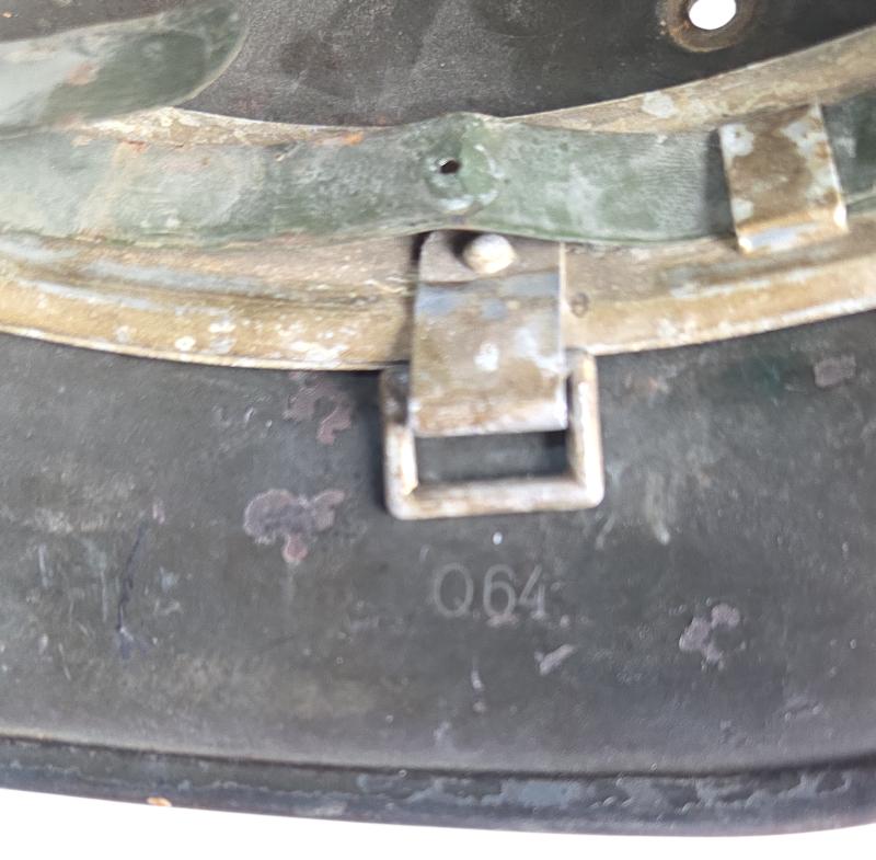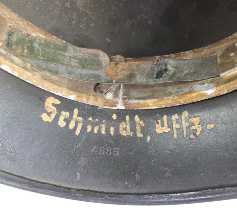 Named uff3 " Unteroffizier " Schmidt" missing chin strap & liner it was first a Luftwaffe helmet, re-issued to a heer you can still clearly see the removal of the decal from the helmet very nice helmet on name