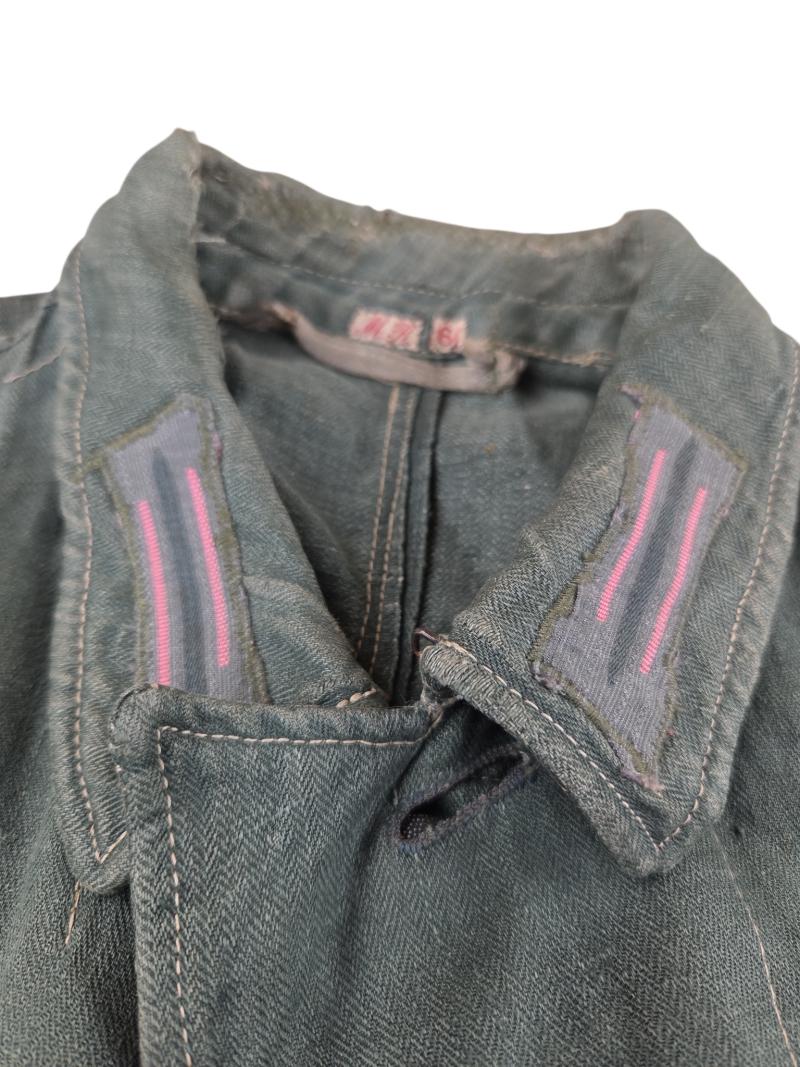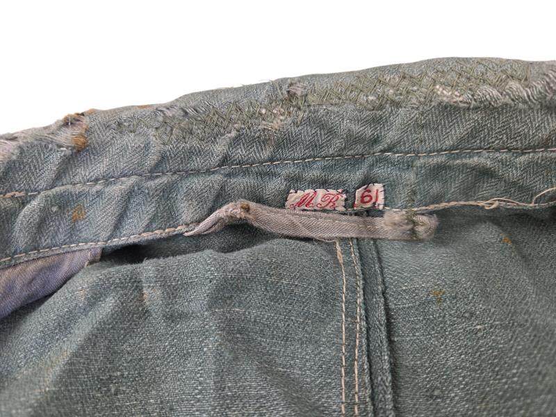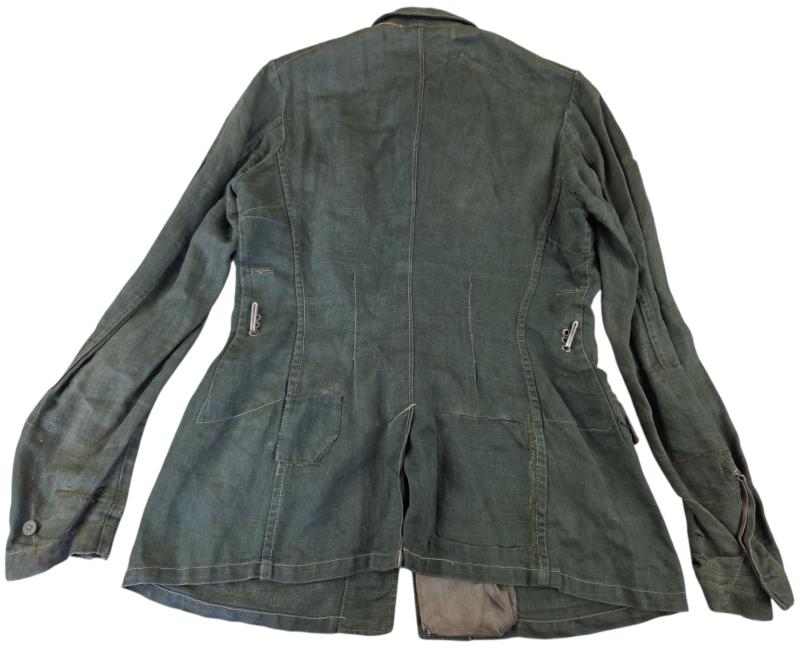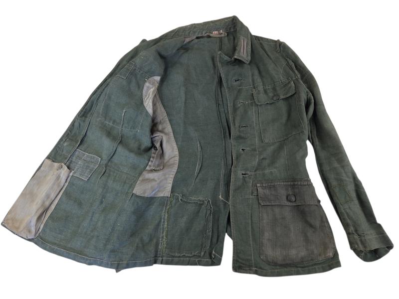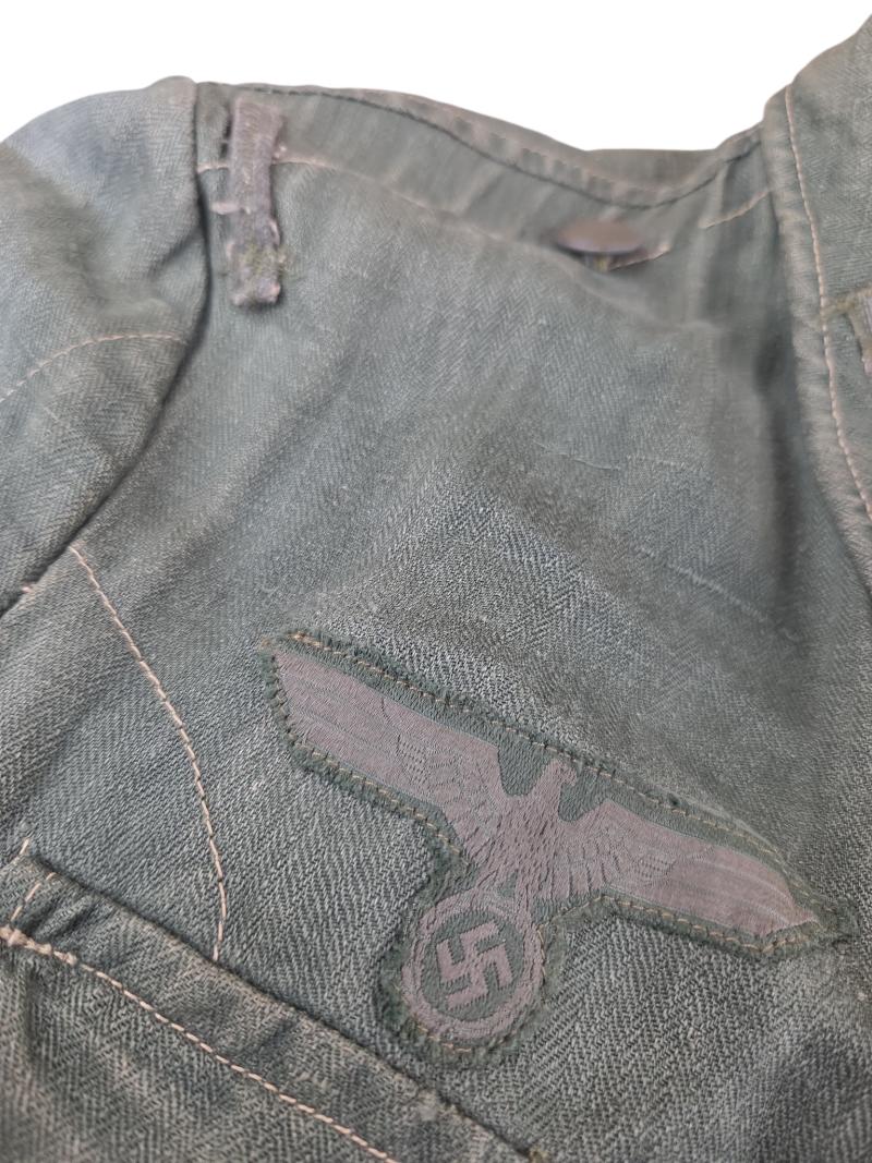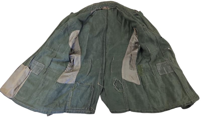 in a used condition a wehrmacht m43 drillich uniform jacket There are a few holes and repair spots visible in the photo. The initials are in it, "M.R." The shoulder emblems are post-war; otherwise, it is a nice jacket in a heavily used condition .